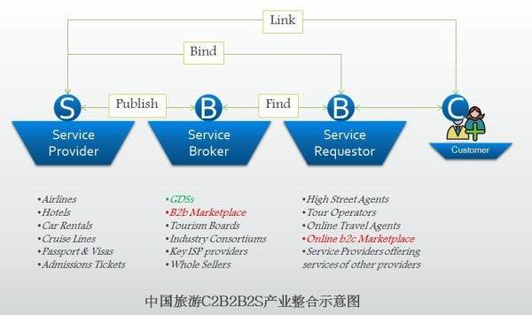 他继而提出我国旅游产业链分析,下图为中国在线旅游产业链,线下旅游产业链,旅游C2B2B2S产业整合示意图: