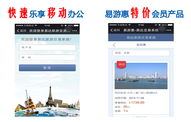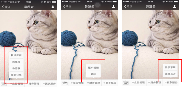 易游大家庭全体成员及各位合作伙伴: 大家期待已久的ETS 移动微信版——易游云,上线啦! 搜索易游云微信号(tourcloud)或扫一扫下方易游云二维码添加关注,立享移动办公轻松体验。 移动改变生活 易游云服务功能 易游云微信端包括 业务处理 以及 财务管理 两大功能模块: (1)一键实现供应商、旅游产品快捷查询;随时随地处理订单;同时增加易游惠特价会员产品订购功能。 (2)随时查账、便捷转账,快捷的财务处理工具,安全,方面,可靠。