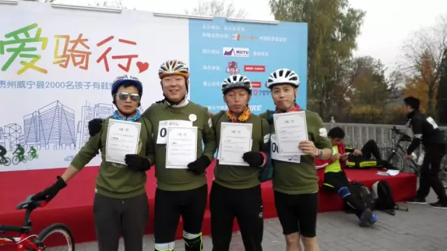 下午17点25分,易游天下国旅四名勇士成员成功完成100公里的骑行挑战,获得组委会颁布的证书,同时,完成为山区儿童的童鞋捐赠!