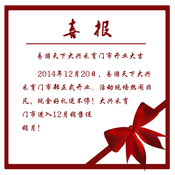 2014年12月20日,易游天下大兴采育门市部正式开业,活动现场热闹非凡、人头攒动。哪怕是零下5摄氏度也无法阻挡易游人的热情。