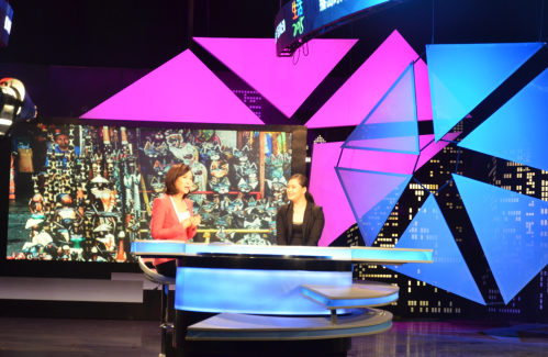 易游天下国际旅行社(北京)有限公司马甸桥营业部负责人李静媛(右)和BTV生活频道主持人高燕(左)在演播厅。