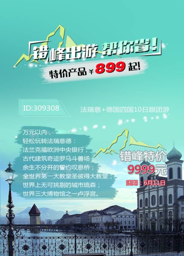 万元以内,轻松玩转法瑞意德:法兰克福欧洲中央银行;古代建筑奇迹罗马斗兽场;余生不分开的誓约叹息桥;全世界第一大教堂圣彼得大教堂;世界上无可挑剔的城市琉森;世界三大博物馆之一卢浮宫。