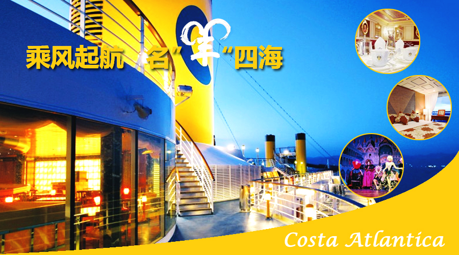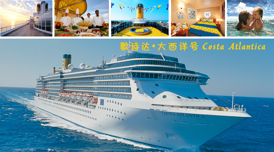 歌诗达•大西洋号(Costa Atlantica)隶属欧洲最大的邮轮公司,船舱总共1057间,可容纳2680人。它是一艘让人心醉神迷的邮轮,黄色烟囱、白色的船体,蓝色的甲板,从踏上它甲板的那刻起,所有惊喜都呈现在每一位造访者眼前。而它让人神魂颠倒的另一方面,是它拥有12个以意大利著名导演弗莱德里克费里尼电影命名的旅客甲板,每个甲板显要位置都有影星的paparazzi照片加以装饰。让人在巡游的同时仿佛置身于其所塑造的令人难忘的角色中。久久无法抽离。