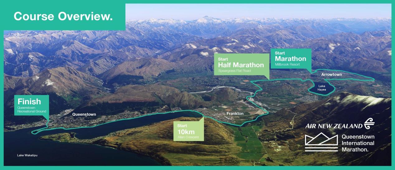 皇后镇马拉松路线的设计堪称完美,南阿尔卑斯山的千年雪峰和瓦卡蒂普湖的美景尽收眼底,每一位跑者都在现实版的“中土世界”潇洒穿行——从米尔布鲁克区(Millbrook)出发,途径海耶斯湖(Lake Hayes)畔进入索托瓦河谷区(Shotover),经过法伦克顿(Frankton),沿着瓦卡蒂普湖(Lake Wakatipu)畔公路抵达市区的终点站,沿途经过乡间、酒庄、湖畔,途经峡湾栈道,一呼一吸中,真正感受到新西兰引以为豪的“百分百纯净”气息。
