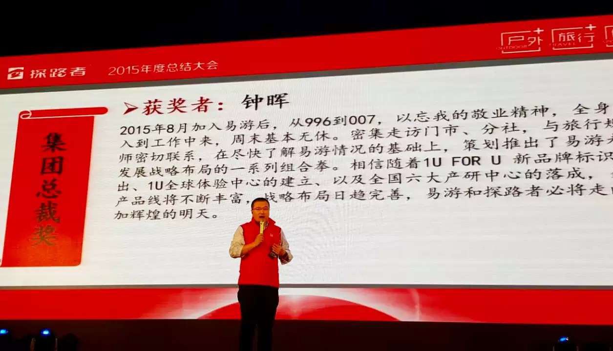 探路者旅行事业群副总裁、易游天下董事总经理钟晖荣膺“集团总裁奖”,并在会上发表感言。近半年来他兢兢业业,带领团队践行户外与旅行的生态协同,通过“户外+旅行O2O线下体验店”的升级改造,“旅游进社区”跨界推广,“产供销一体化”会销,构建场景化营销体系,并表示2016年将带领团队打造有温度的体验式旅行产品,在“互联网+创新”的时代,利用用户中心思维,为实现“数据驱动、生态协同”而勇往直前,奋斗不止。