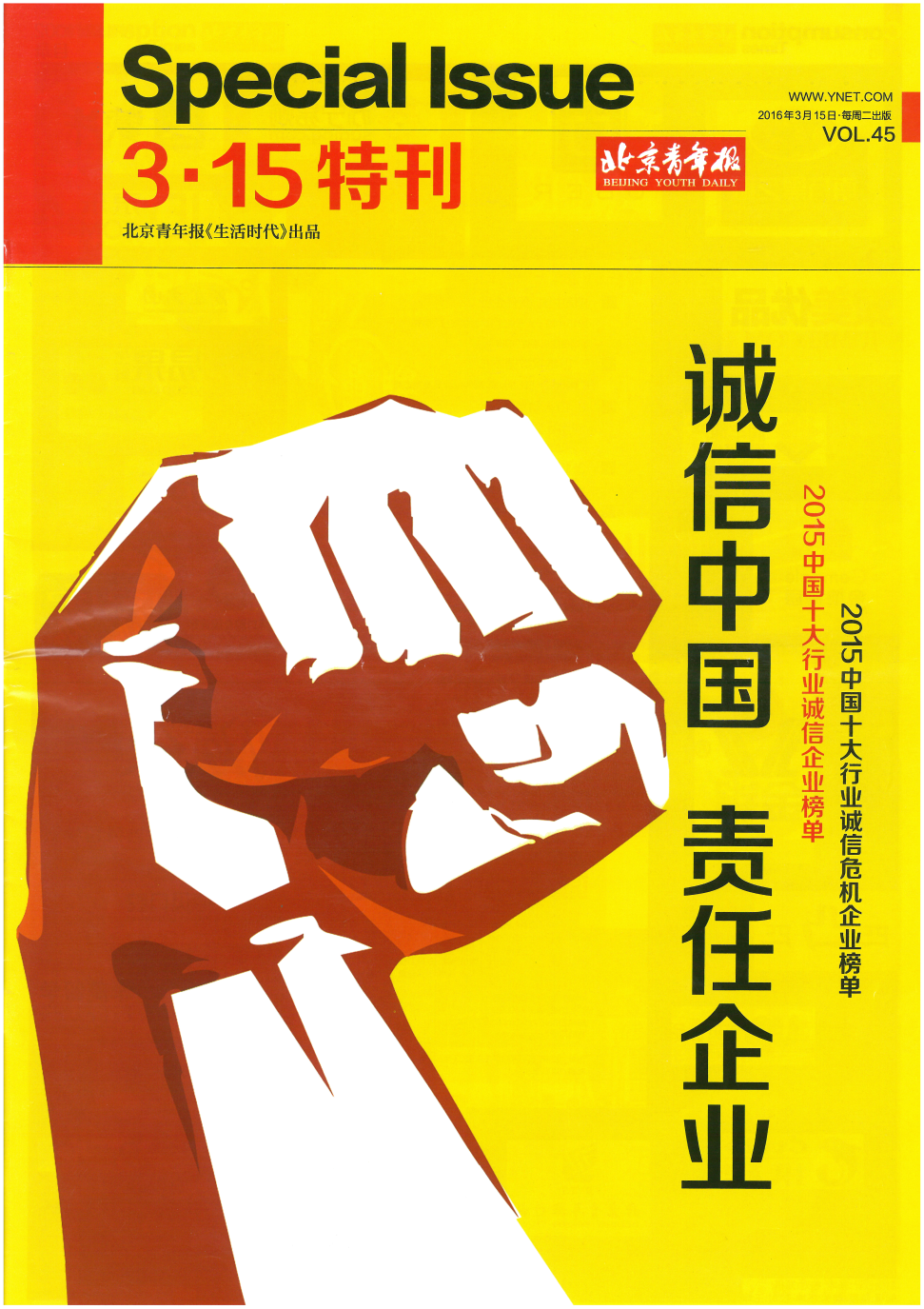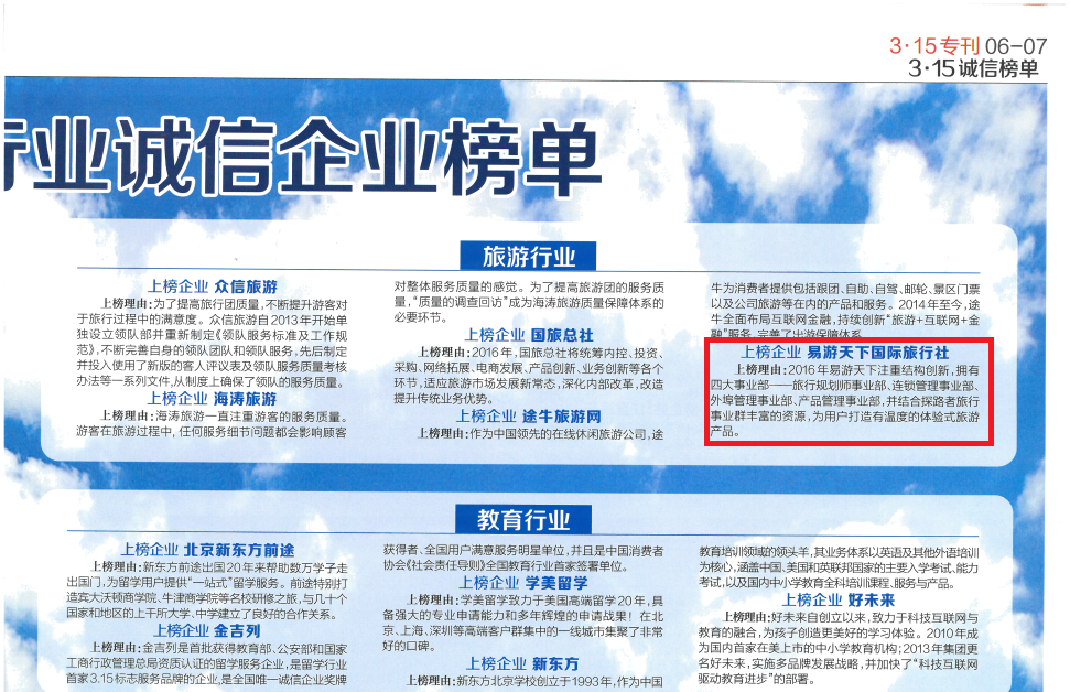 ▲易游天下上榜2015中国十大行业诚信企业榜单