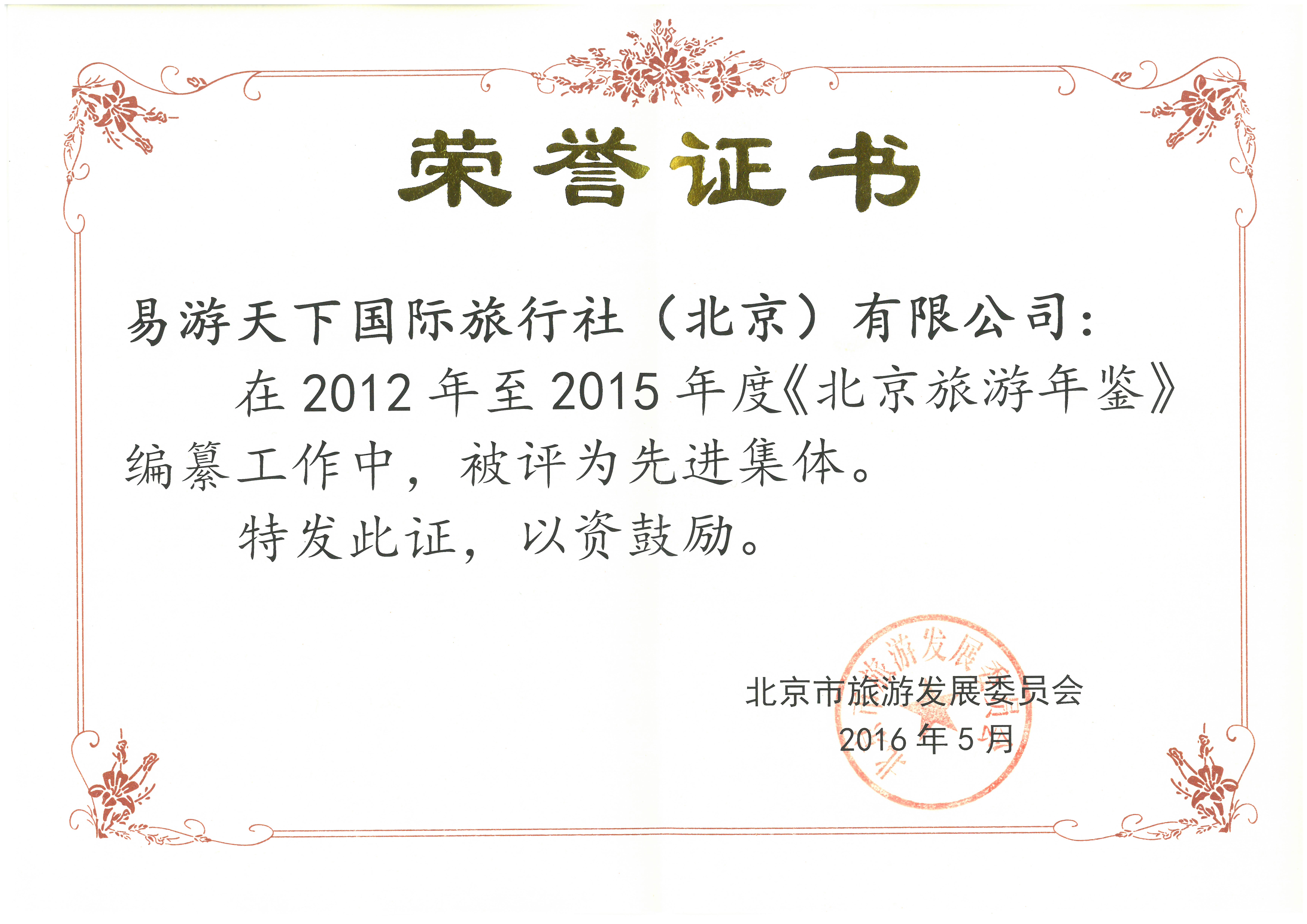 5月5日,在北京旅游大厦召开《北京旅游年鉴》工作会议,易游天下被北京市旅游发展委员会评为《北京旅游年鉴》编纂工作先进集体。
